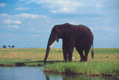 African elephant, Chobe National Park, Botswana. The picture is taken from a boat on the river, the elephant is actually on an island disputed by Namibia and Botswana. |
