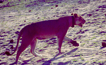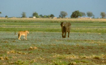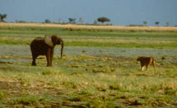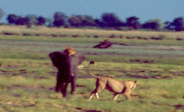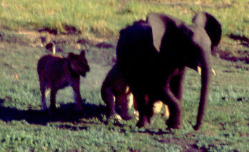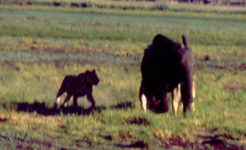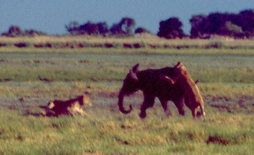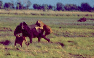 The young elephant started to run toward the truck from where these photos were taken, carrying the three cats on his back and flanks. Distracted by the truck, two of the lionesses let go. The third continued clawing at the elephant for a while, but finally gave up as well, frustrated, her paws dripping with blood and her lungs laboring from the chase. |