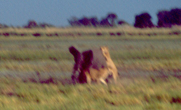 The young elephant started to run toward the truck from where these photos were taken, carrying the three cats on his back and flanks. Distracted by the truck, two of the lionesses let go. The third continued clawing at the elephant for a while, but finally gave up as well, frustrated, her paws dripping with blood and her lungs laboring from the chase. |